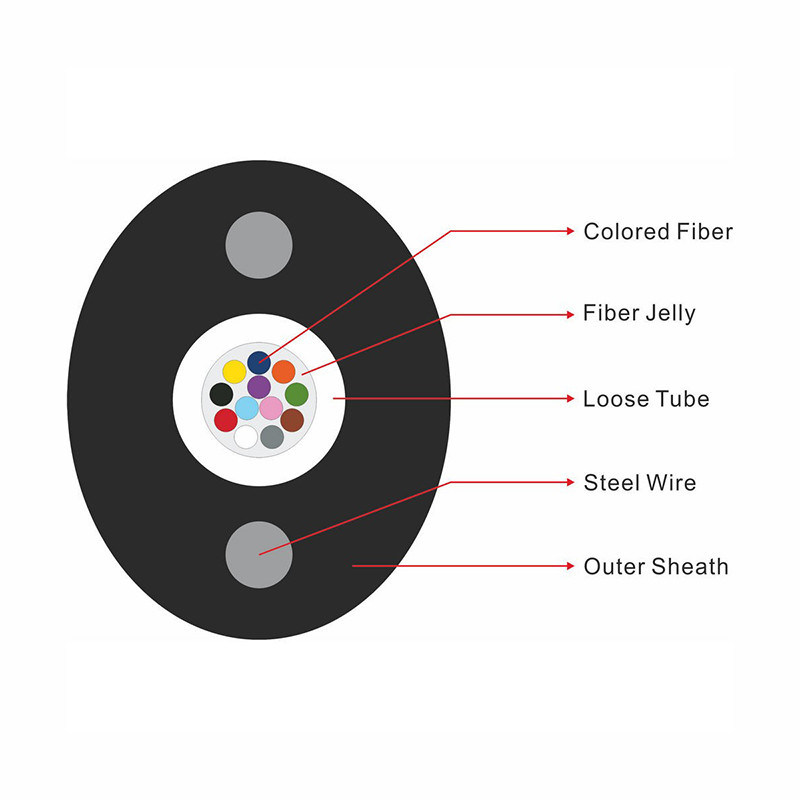 Włókna, 250μm, są umieszczone w luźnej tubie wykonanej z wysokomodułowego tworzywa sztucznego.Rurki wypełnione są wodoodporną masą wypełniającą.Po obu stronach taśmy stalowej umieszczone są dwa równoległe druty stalowe.Kabel zakończony jest osłoną z polietylenu (PE).